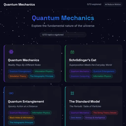 Play NowExplore the strange world of quantum mechanics through interactive simulations covering the double-slit experiment, entanglement, tunneling, and Schrödinger's cat.